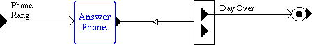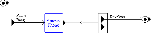 Read First: Event Diagram, Event, Event Type A creation event of an event diagram means "the event diagram has started". It is called "creation" because an instance of the operation is created to model the running process. Creation event types are notated in OOIE with a bulls-eye preceding it. Once an event diagrams is started, it may take an arbitrarily long time to finish. For example:In the above case, the event Bill Paid may a take a long time to happen, or may not happen at all. When the event diagram execution waits at the control condition, it is still running, but it is waiting. Events that are not creation events, like Bill Paid, are called external events, meaning they are caused by operations that are not controlled by the diagram (see Operation^IsExternal). Diagrams that do no preparation before waiting for an event to happen can omit the creation event: The above event diagram has no creation event, since there is no preparation to answering the phone, but someone must still start executing the diagram at the beginning of business to detect the Phone Rang event. The diagram has a trigger rule to terminate itself at the end of the day. Omitting the creation event is purely a presentation shorthand, so the model underlying the diagram should still have a creation event even though it isn't displayed. The model for the above diagram would actually look like this: The creation event does not trigger anything, because its only function is make the diagram active, so it waits for the phone to ring. Getting information into an event diagram The creation event does not contain any information about what started the event diagram, only that it has started with certain values of its input variables. In contrast, a external event is waiting for a particular object to change state, so the event diagram is tied to what will cause it to start processing. In both cases, the event diagram has access to information passed in through its input variables. In the external event case, additional information is available in the event object. For example, if a external event type is Traffic Light Changed Color, the event object will contain the specific traffic light and specific color. Read First: Event Diagram, Event, Event Type